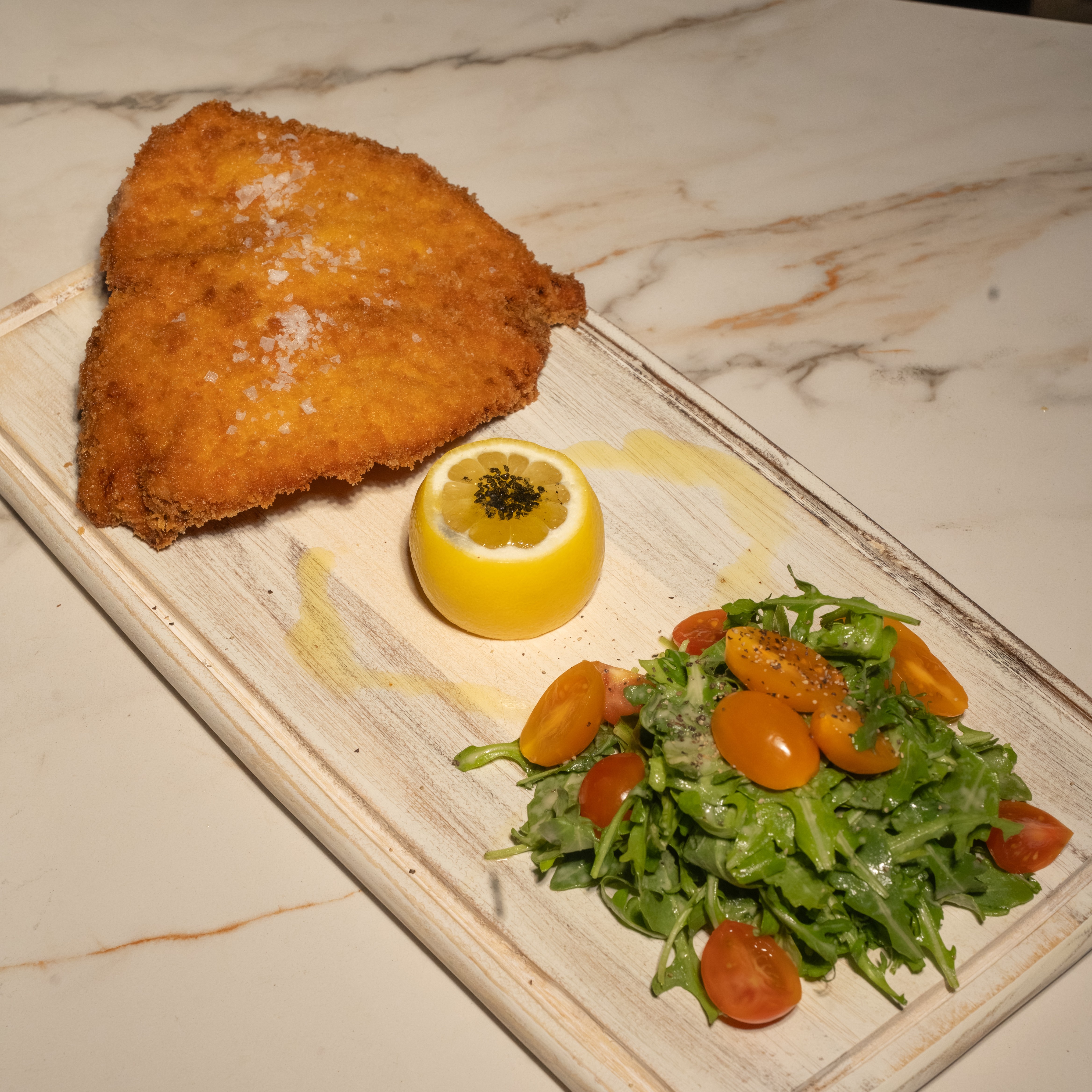 Sauteed and breaded pounded flat chicken cotelette, served with arugula tomatoes, parmigiano cheese, roasted potatoes